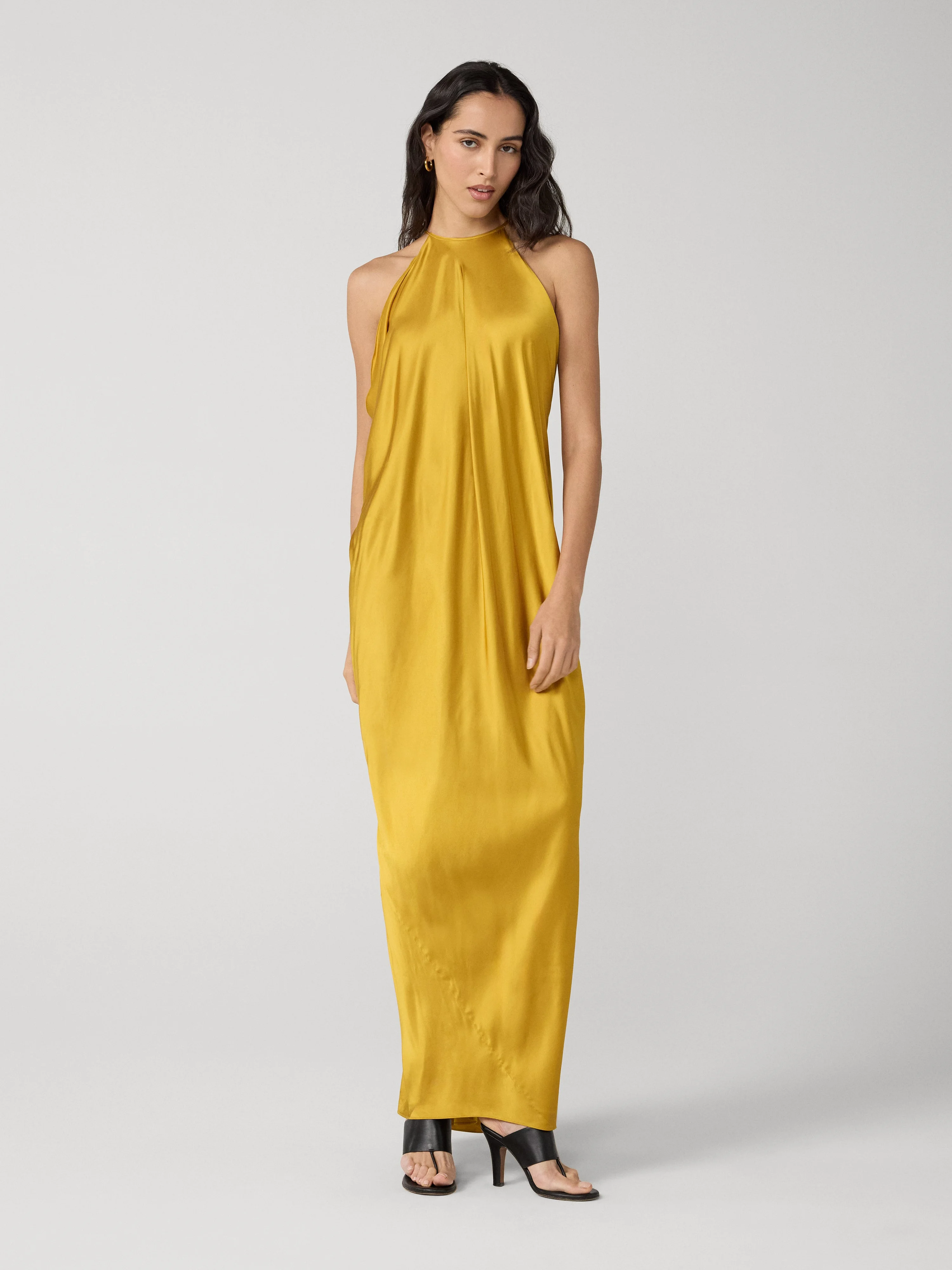 The Tansy Dress features a stunning silhouette and an open back in a vibrant, bold hue. - High neckline - Halter - Spaghetti strap - Loose silhouette - Y open back - Maxi length Size & Fit Gia is 5'11" and is wearing a size XS Fabric & Care With a silky surface and sultry drape, Stretch Satin is ultra effortless, balancing softness and stretch. 53% Viscose 44% Rayon 3% Spandex Dry Clean Only