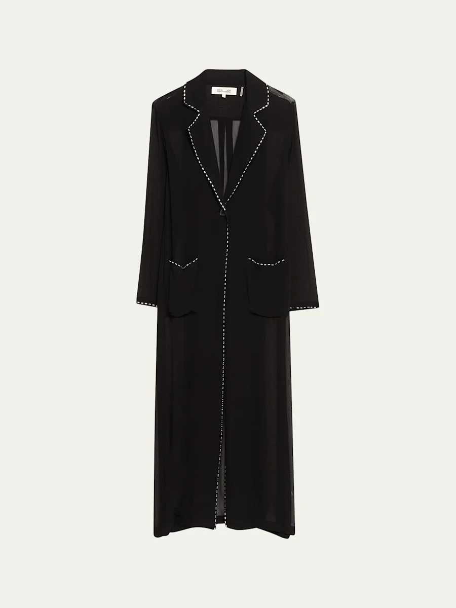 The "Vesper" duster from Diane von Furstenberg is cut from lightweight, sheer chiffon and decorated with sparkling glass crystals Notched lapels; singlebutton front Long sleeves Back yoke with inverted pleat Hip patch pockets Hem falls below the knee Straight silhouette Viscose Imported