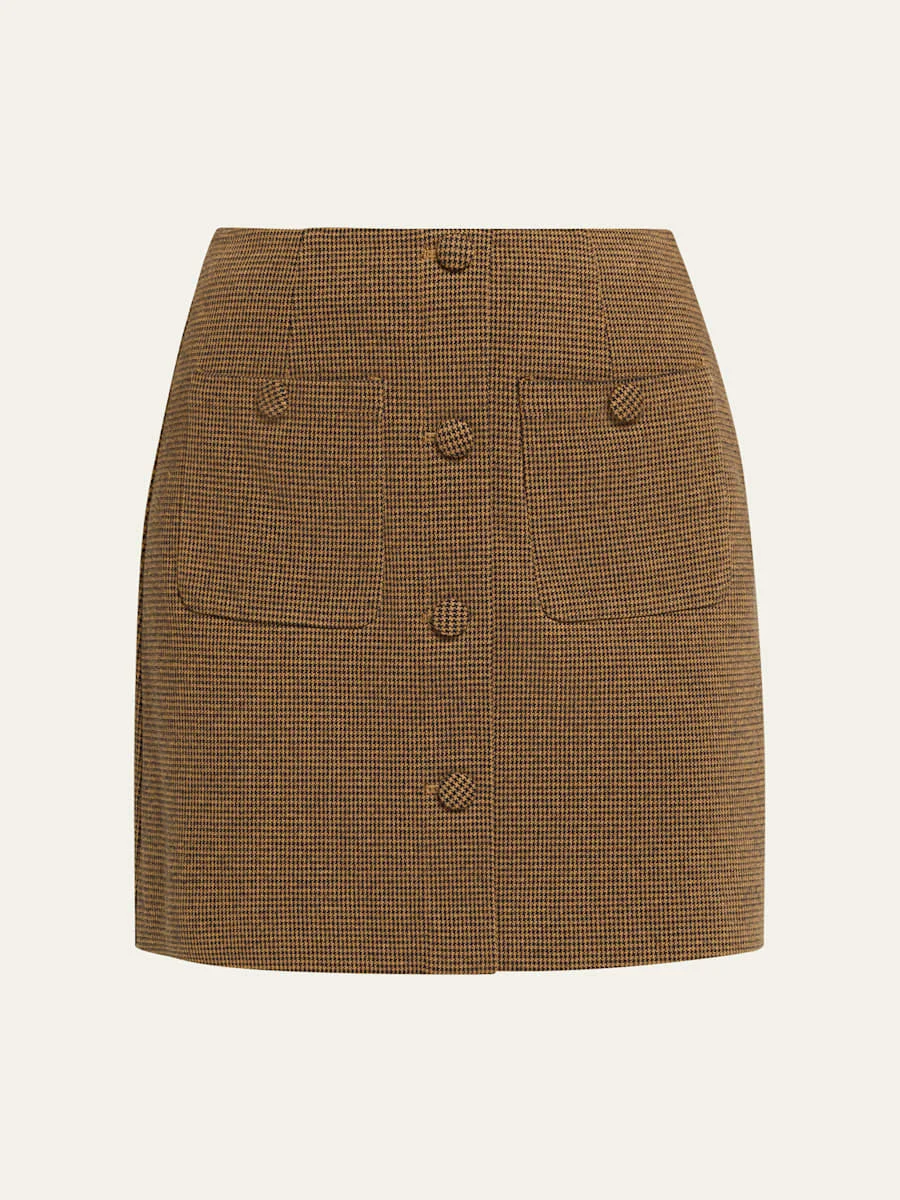 The structured Diane von Furstenberg "Waverly" mini skirt is designed in a micro houndstooth jacquard knit, complete with self-covered buttons and vertical waist darts for a polished finish Sits high on the hips Button front closure Front patch pockets Hem falls above the knee A-line silhouette Cotton/polyester/spandex Imported Online Inquiries: BGS21_T8RQR| Store Inquiries: #5371269