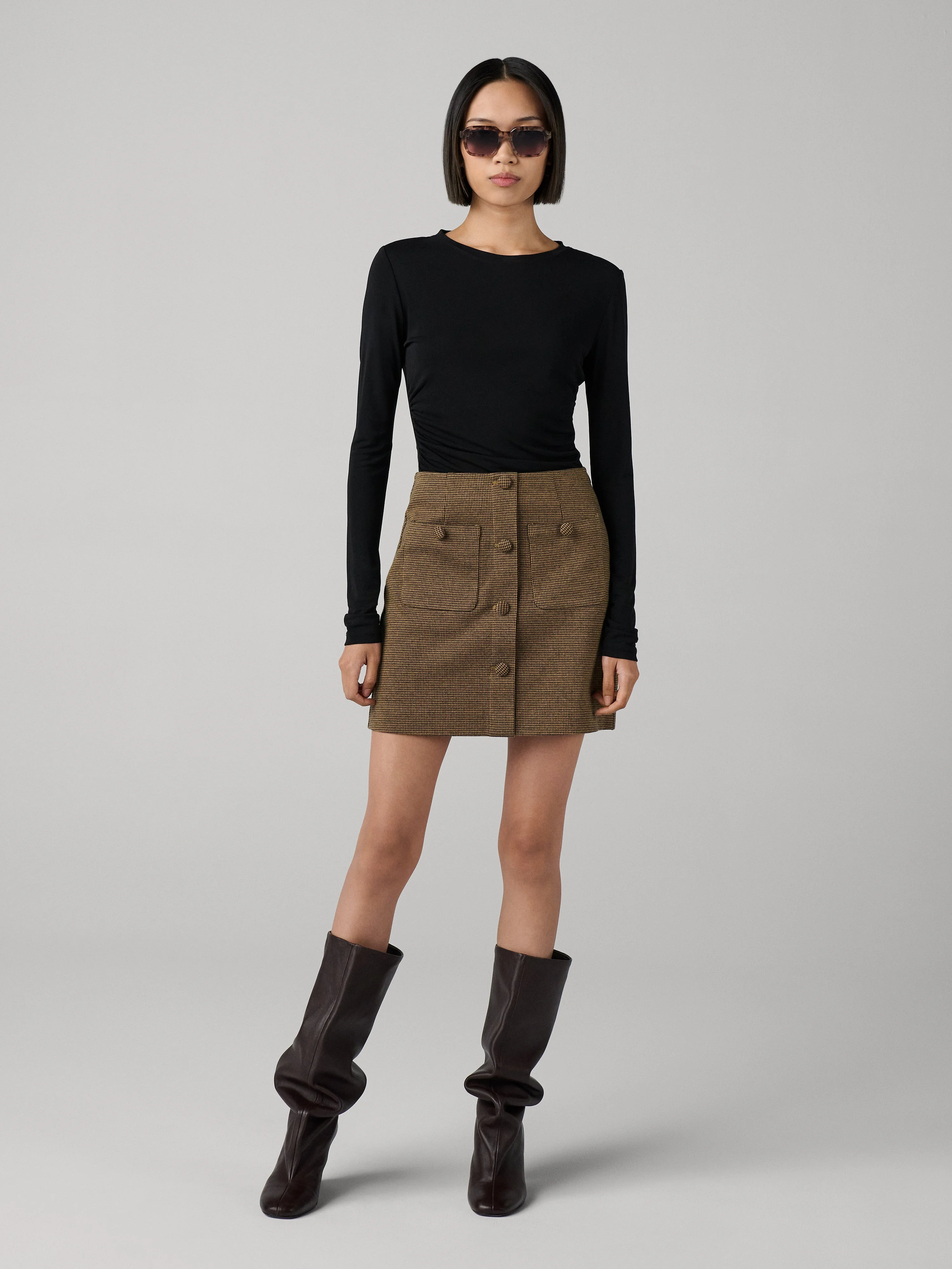 Tailored in knit houndstooth, the Waverly Skirt is the ultimate fall staple. - Mid to high rise - Front pockets - Buttons down center - Mini length Size & Fit Anais is 5'10" and is wearing a size 2 Fabric & Care A structured knit detailed with a woven houndstooth print that gives it a textured feel and an edgy look. 70% Cotton 28% Polyester 2% Spandex Dry Clean Only
