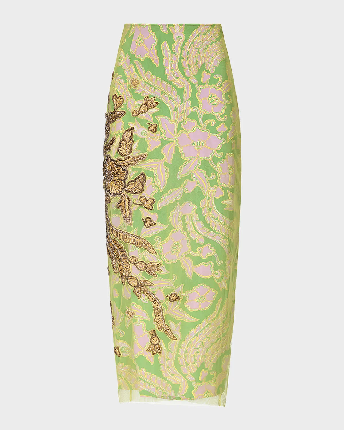 The "Gramercy" maxi skirt from the Diane von Furstenberg x Henry Zankov collection is printed with bright florals and features a flourish of intricate beadembroideredy on a sheer mesh overlay The capsule collaboration is a harmony between DVF's legendary prints and Zankov's distinctive visual language Sits high on the hips Center back slit Ankle length Straight silhouette Nylon/polyamide Imported