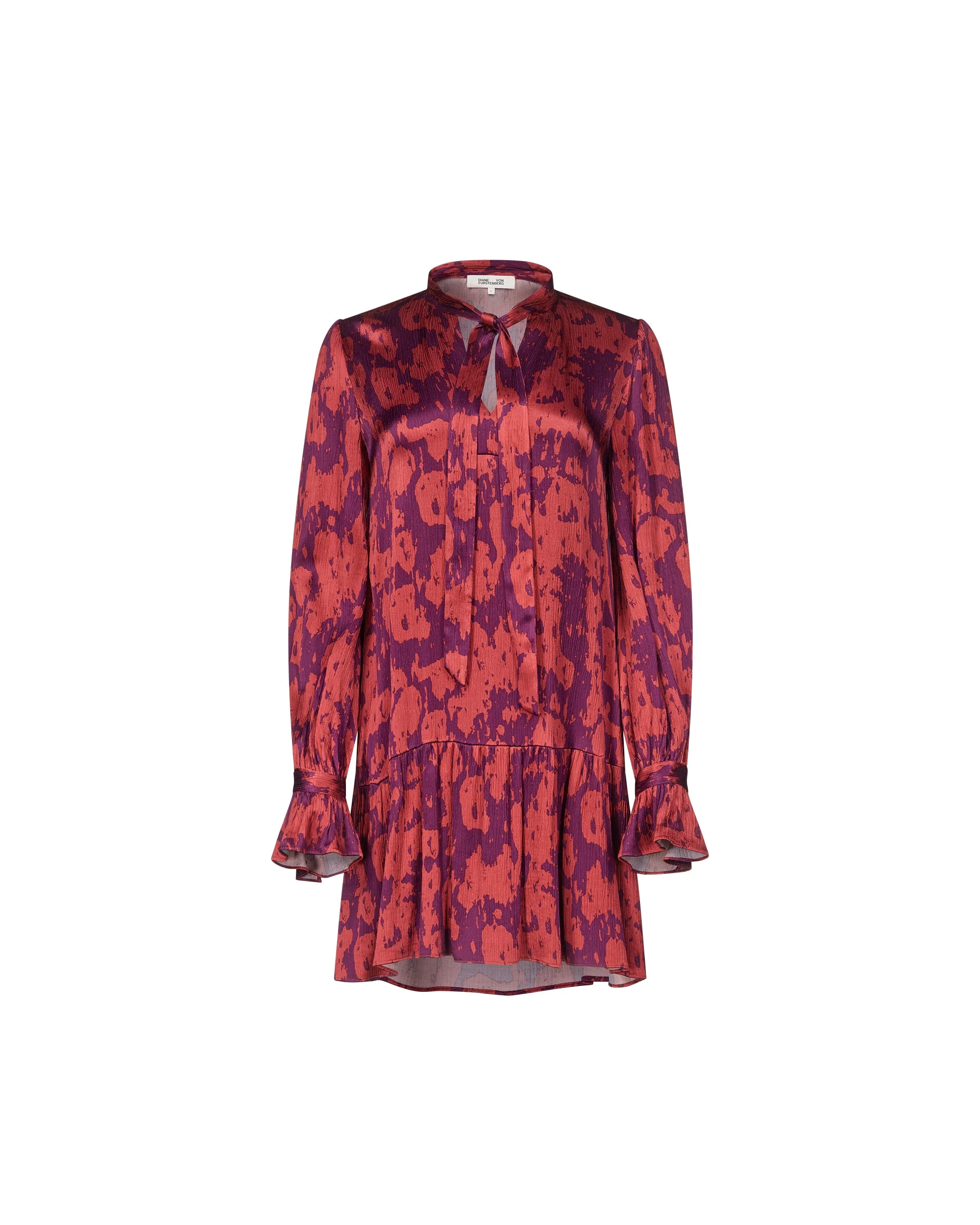 Crafted from lightly textured satin with a subtle sheen, the Yvonne Dress is a shift silhouette finished with a flirty necktie. - V neck - Necktie - Long sleeves with ruffled cuff - Shift silhouette - Mini Length Size & Fit Anais is 5'10" and is wearing a size XS Fabric & Care This fabric presents the smooth shine of satin with a soft, subtly textured finish. 59% Viscose 49% Rayon Dry Clean Only