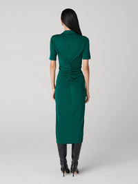 Made from a soft matte jersey, the Zoey midi dress has a soft feel and a smooth finish. - V-neckline - Classic collar - Short sleeves - Buttons down the front - Ruched bodice - Close fit - Centered slit Size & Fit Milano is 5'10.5" and is wearing a size XS Fabric & Care A soft, smooth jersey with a clean finish that takes well to bright colors and bold prints. 100% Viscose