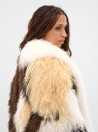 Brown and white coat in patchwork shearling with a deep v-neckline and oversized silhouette. Featuring: • Oversized fit • Shearling construction • Patchwork design • V-neckline • Long sleeves • Main: 100% Shearling • Standard sizing