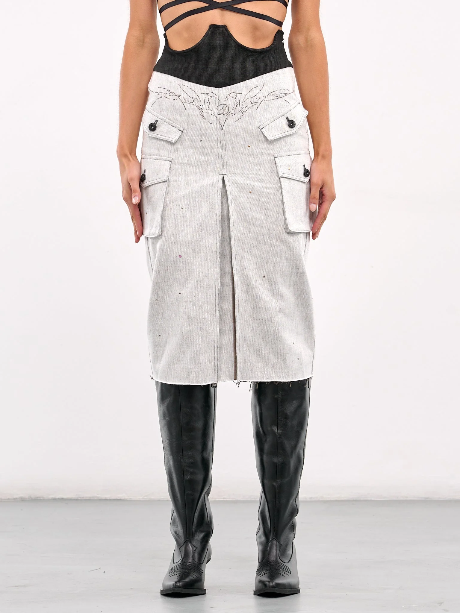 DIDU skirt in off-white, paneled mixed-material construction, high waist, waistband-angled ribbing, side concealed zip closure, front graphic detailing, side buttoned flap pockets & cargo pockets, back patch pockets, front slit, raw hems, straight hemline, midi-length, slim fit. Standard Sizing Model is 5'8" wearing size S. Bust: 32.5" Waist: 24" Hips: 34"