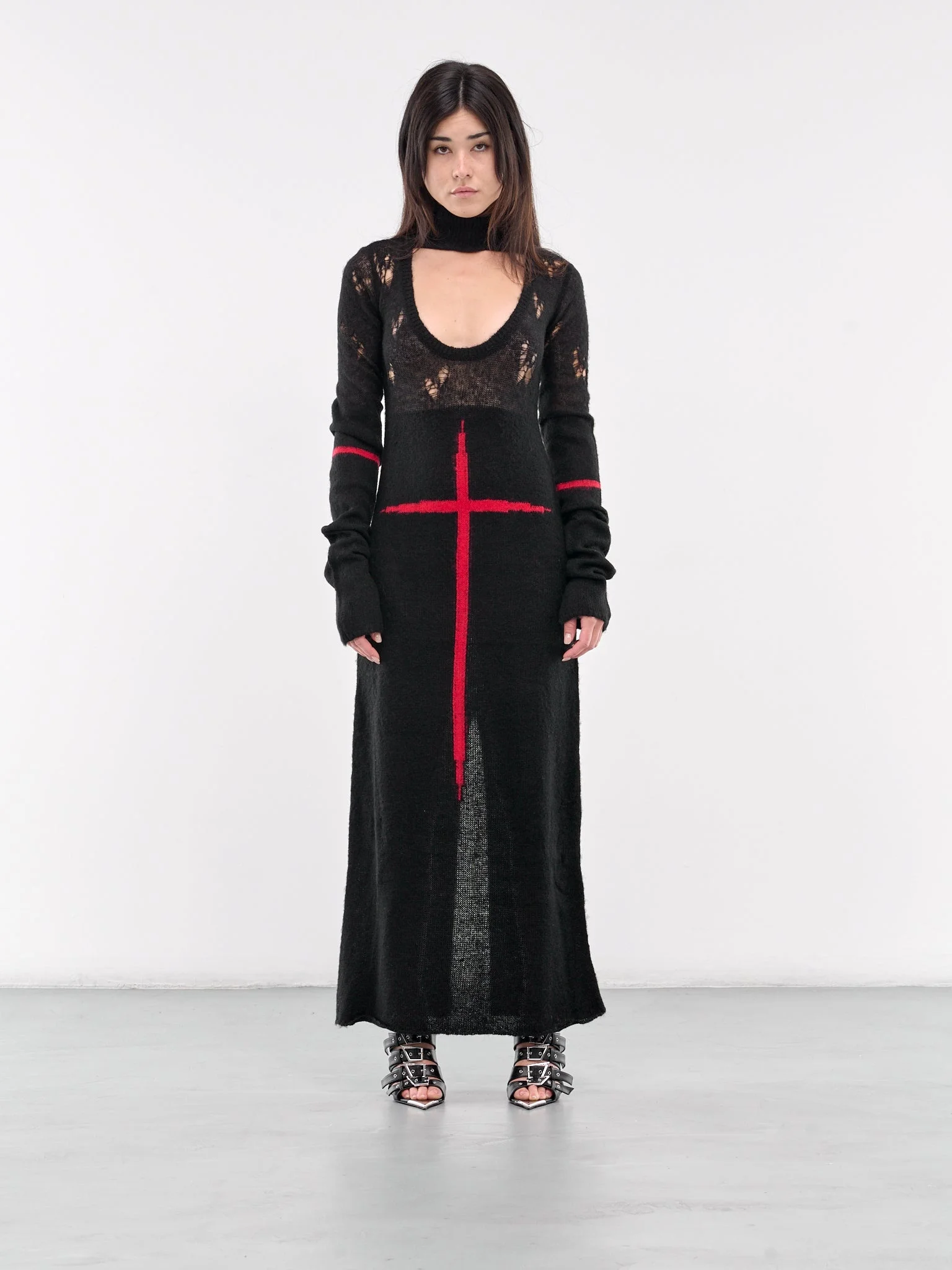 DIDU dress in black, acrylic-nylon blend, paneled knit construction, distressed, jacquard knit cross pattern, scoop neck, long sleeves, straight hem, maxi-length, slim fit. 55% Acrylic 30% Nylon 10% Wool 5% Mohair Standard Sizing Model is 5'8" wearing size S. Bust: 32" Waist: 24" Hips: 33"
