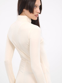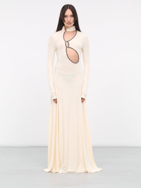 DIDU white dress, qipao design, upright collar, asymmetric cut-outs, front clasp, elongated sleeves, floor length, fitted. Standard Sizing Model is 5'8" wearing size S. Bust: 32" Waist: 26" Hips: 34.5"