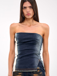 DIDU top in blue, tube top design, paneled denim construction, fading, contrast topstitching, straight neckline, strapless, bust darting, side contrast piping, frayed edges, side vent, straight hemline, slim fit. Standard Sizing Model is 5'8" wearing size S. Bust: 32.5" Waist: 24" Hips: 34"