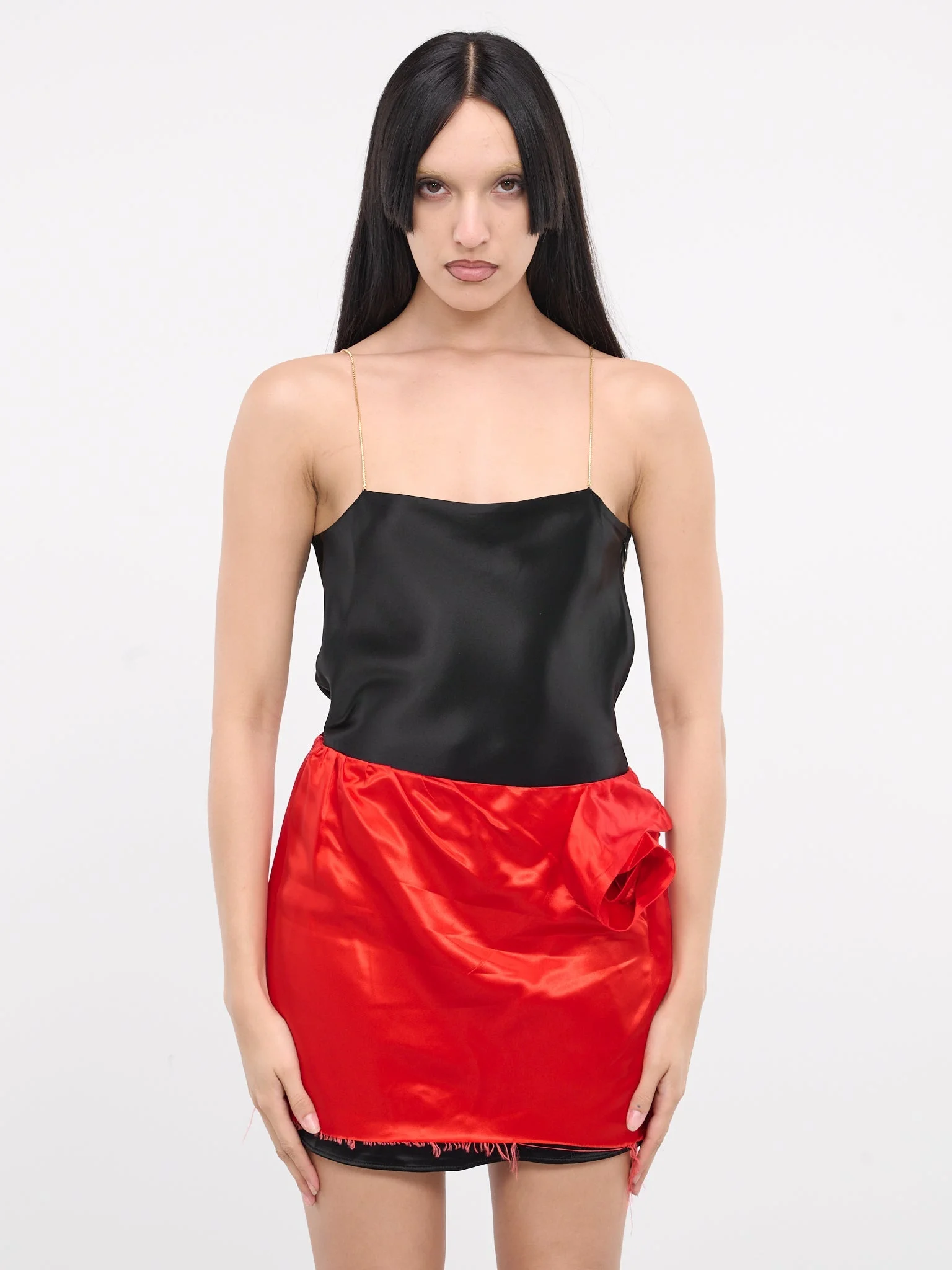 DIDU tank in black, camisole design, acetate-polyester blend, paneled satin construction, gold-tone chain spaghetti straps, straight neckline, sleeveless, back adjustable strap, open back, side concealed zip closure, relaxed fit. 76% Acetate 24% Polyester Standard Sizing Model is 5'8" wearing size XS. Bust: 32" Waist: 26" Hips: 34.5"