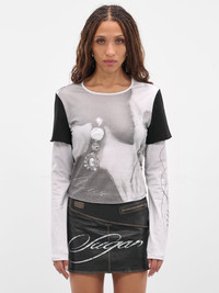 Black and gray t-shirt in cotton with a layered sleeve design and cropped slim fit. Featuring: • Slim fit • Cropped length • Cotton construction • Graphic print • Crewneck • Layered short and long sleeves • Main: 100% Cotton • Standard sizing