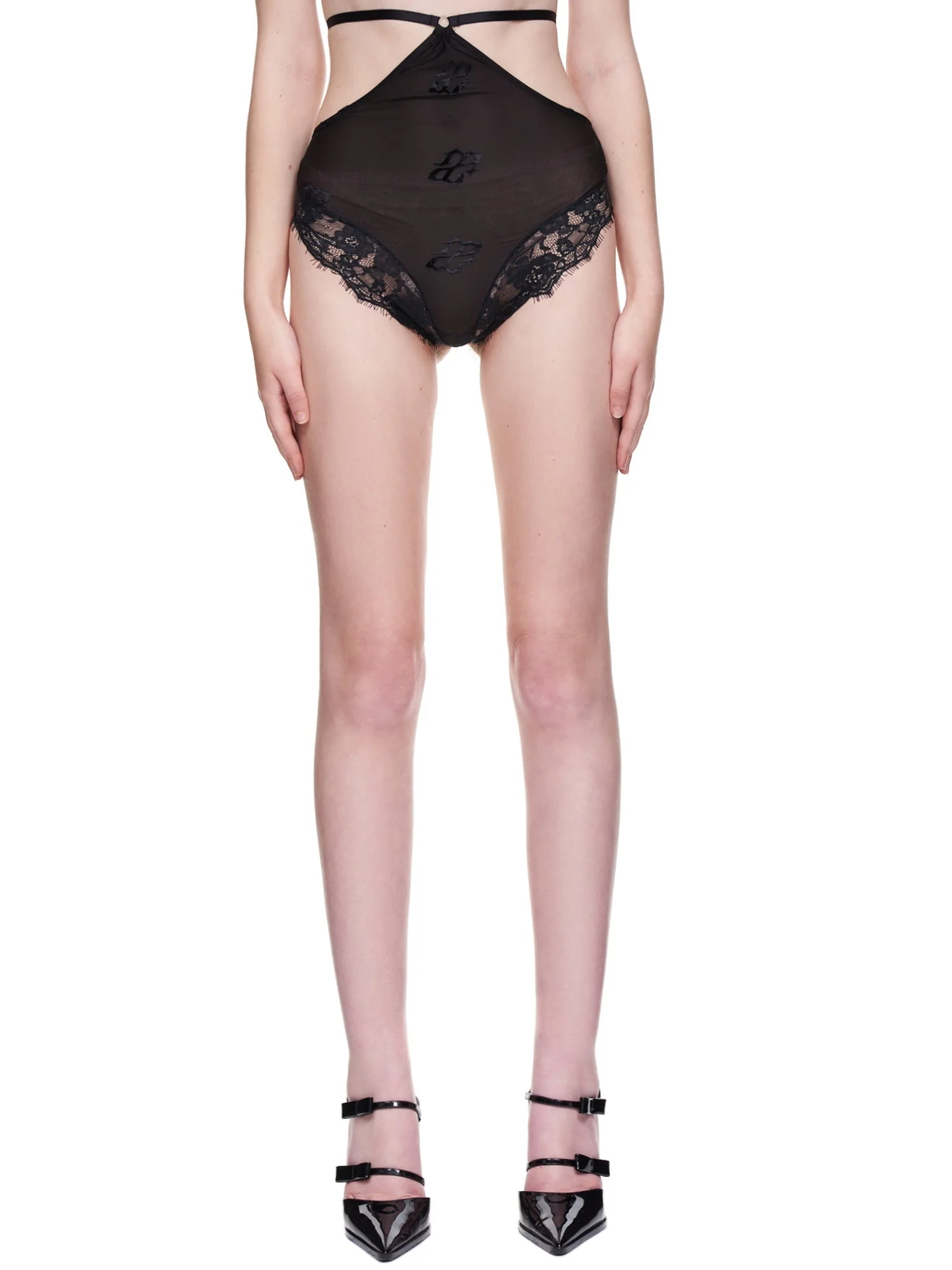 Didu bottoms in black, high waisted, adjustable strap around chest, tonal jacquard logo pattern throughout, lace hem. Standard Sizing. Composition: 25% Nylon, 67% Tencel, 8% Polyurethane. Model is 5'9" and is wearing a size XS. Bust: 32" Waist: 23" Hips" 34"