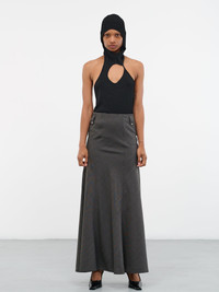 DIDU top in black, rib knit, hooded collar, center cut-out, sleeveless, open back, o-ring detail, slim fit. Standard Sizing 100% Nylon Model is 5'7" wearing size XS. Bust: 32" Waist: 24" Hips: 34"