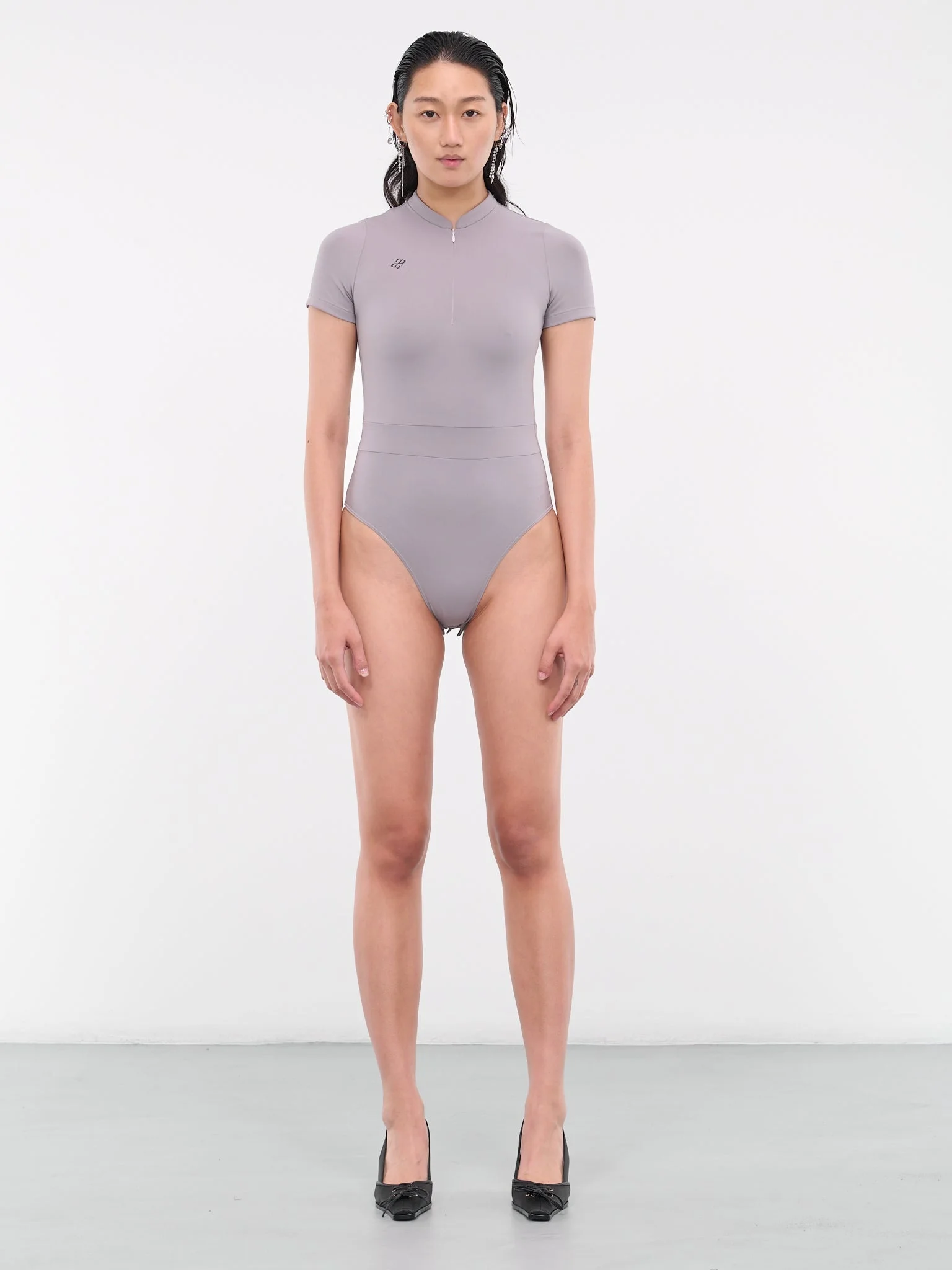DIDU purple bodysuit, stretch fabric, logo detail, band collar, quarter zip closure, short sleeves, high cut, snap button bottom, fitted. Standard Sizing Model is 5'10" wearing size S. Bust: 31" Waist: 23.5" Hips: 35"