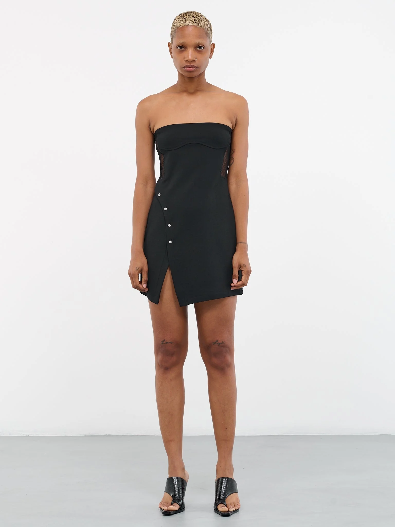 DIDU dress in black, strapless, mesh paneling, side seam closure, studded details, front vent, mini length, fitted. Standard Sizing 96% Polyester, 4% Polyurethane Model is 5'7" wearing size S. Bust: 32" Waist: 24" Hips: 34"