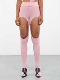 DIDU pants in pink, integrated tabi toe, rib knit, high-elastic waist, leg cut-outs, fitted. Standard Sizing 100% Nylon Model is 5'7" wearing size XS. Bust: 32" Waist: 24" Hips: 34"