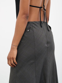 DIDU skirt in grey, wool construction, low waist, belt loops, studded details, concealed back zip closure, back vent, maxi length, ruffled hem, tailored fit. Standard Sizing 100% Wool Model is 5'7" wearing size S. Bust: 32" Waist: 24" Hips: 34"