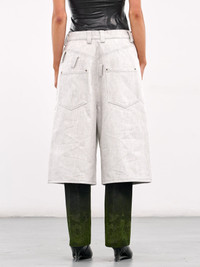 DIDU shorts in off-white, paneled construction, belt loops, front button & concealed zip fly closure, deconstructed belt loops, inset pockets, coin pocket, side overlay pocket & zip pocket, back patch pockets, straight hem, below-knee length, wide leg, baggy fit. Standard Sizing Model is 5'8" wearing size S. Bust: 32.5" Waist: 24" Hips: 34"
