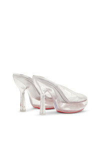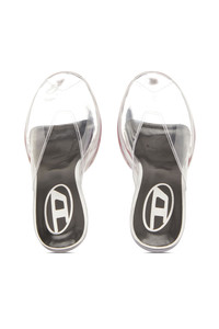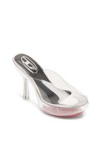 Product Description Hot off the Diesel SS25 runway, this women's open-toe mule sandal will make you stand tall and stand out. With a 3cm platform and 12cm heel, the shoe generates 9cm of lift. Made from acetate with a clear TPU upper, it's nearly invisible from afar. The transparency is playfully offset by the mirror shine of the toes and vivid red of the sole made from grippy, logo-embossed rubber. ID: Y03665P8256 Materials & Details Composition: 100%Thermoplastic Polyurethanes Spring Summer 2025 Runway Show 3cm platform with gripped rubber bottom 12cm heel