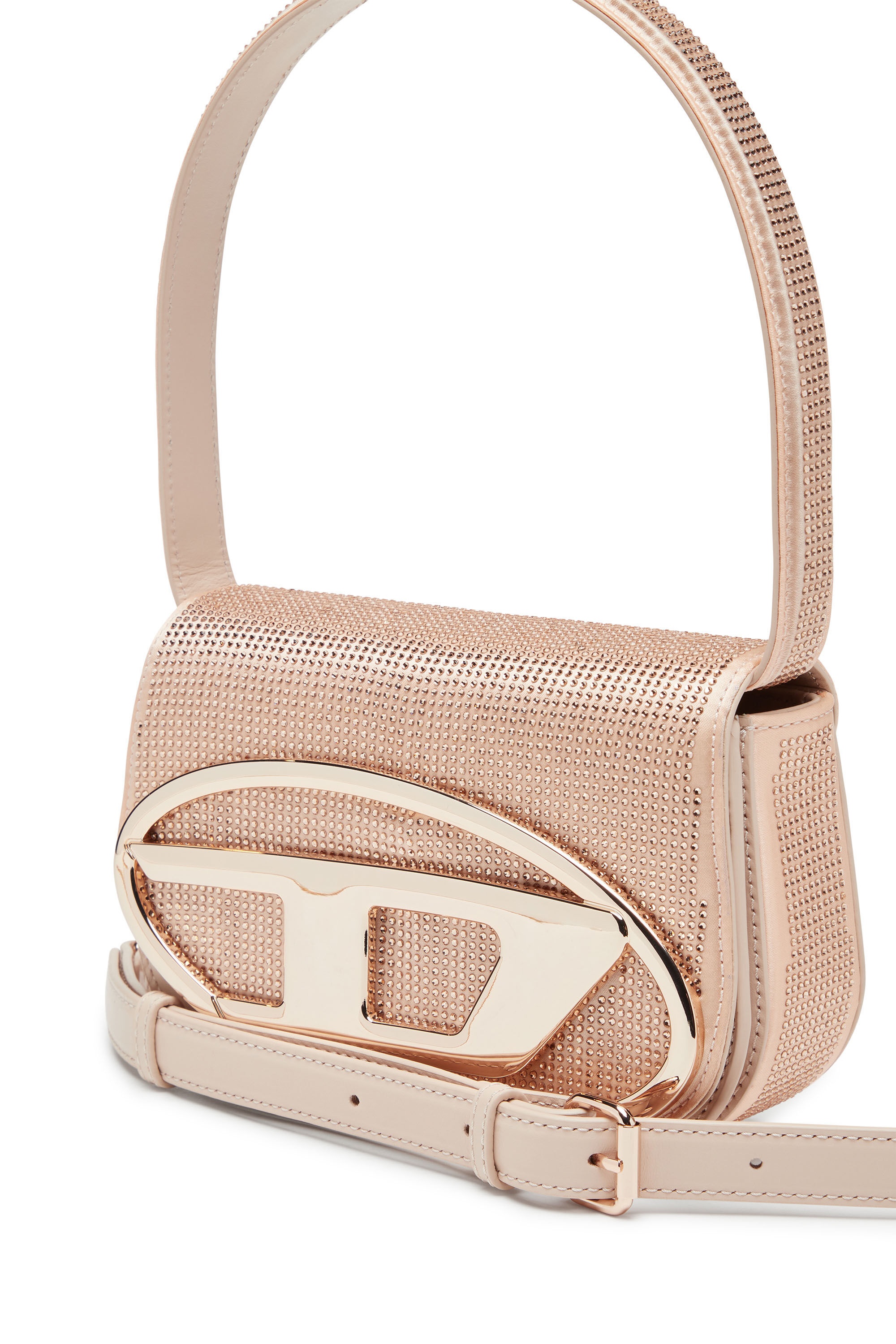 Featuring a compact flap silhouette, this women's shoulder bag is an iconic Diesel accessory from the Fall Winter 2023 Runway Show. It's crafted from nylon satin, illuminated with all-over rhinestones and a tonal oval D metal plaque. Fitted with a top handle and a longer strap for versatile styling.