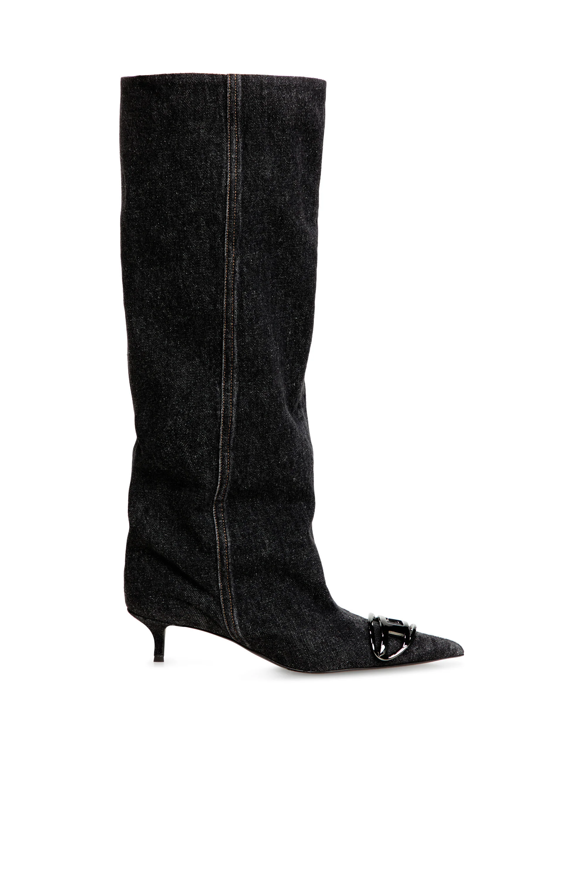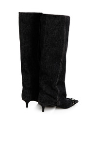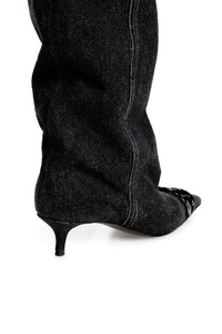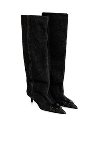 Product Description Slouchy in blue denim, this women's boot adapts to every mood. The knee-high shaft can be turned down to reveal its soft leather lining, scrunched for laissez-faire ease, or worn tall with a contemporary edge. Gunmetal-tone Oval D hardware defines the pointed toe. Set on a 4 cm kitten heel – elevated yet effortless – the shoe brings poise without the pinch. ID: Y03765P5237 Materials & Details Composition: 100%Cotton Slouchy shaft 4 cm kitten heel Leather lining