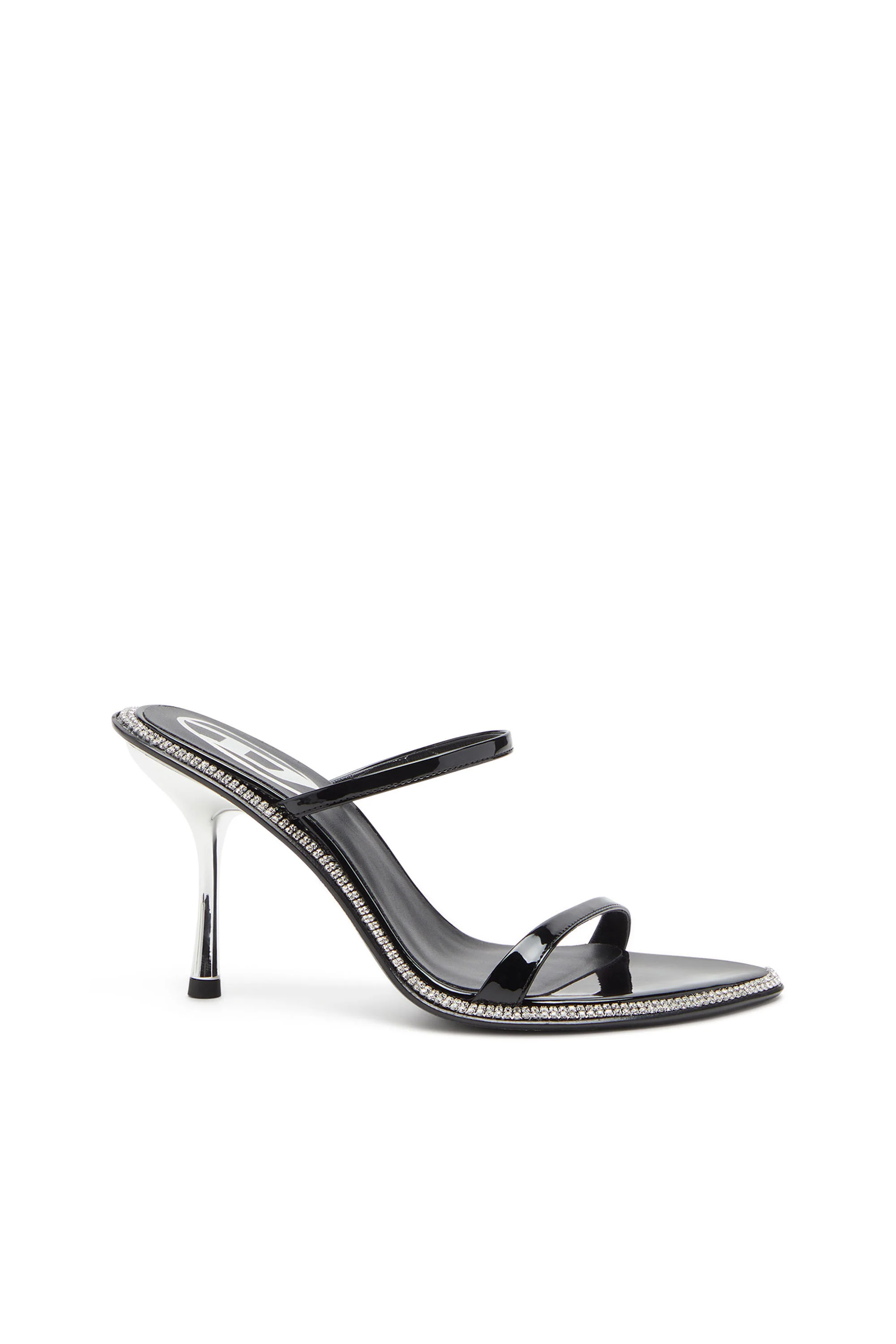 Product Description These women’s mule sandals feel undeniably glamorous. Embellished with two rows of crystals along the footbeds, they have delicate straps in black patent PU, teardrop-shaped toes and leather soles. The mirror-shine silver stiletto heel offers 9cm of lift. ID: Y03463P8402 Materials & Details Composition: 100%Polyurethane 9cm stiletto heel Leather outsole
