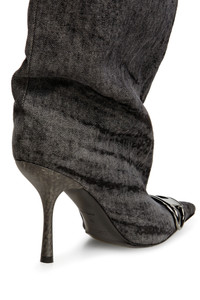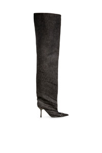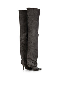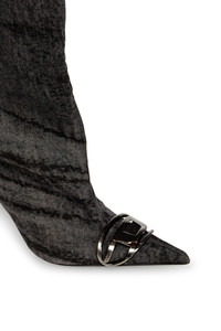 Product Description These women’s over-the knee boots in coated black-wash denim are an exclusive Fall Winter 2025 Runway Show style. Designed with a wide, slightly slouchy shaft that engulfs the leg from ankle to thigh, these cuissardes feature sharply pointed toes and 9cm stiletto heels. The bold Oval D hardware is an expression of Diesel’s identity. Made in Italy. ID: Y03802P8665 Materials & Details Composition: 100%Cotton Fall Winter 2025 Runway Show 9cm stiletto heel Made in Italy