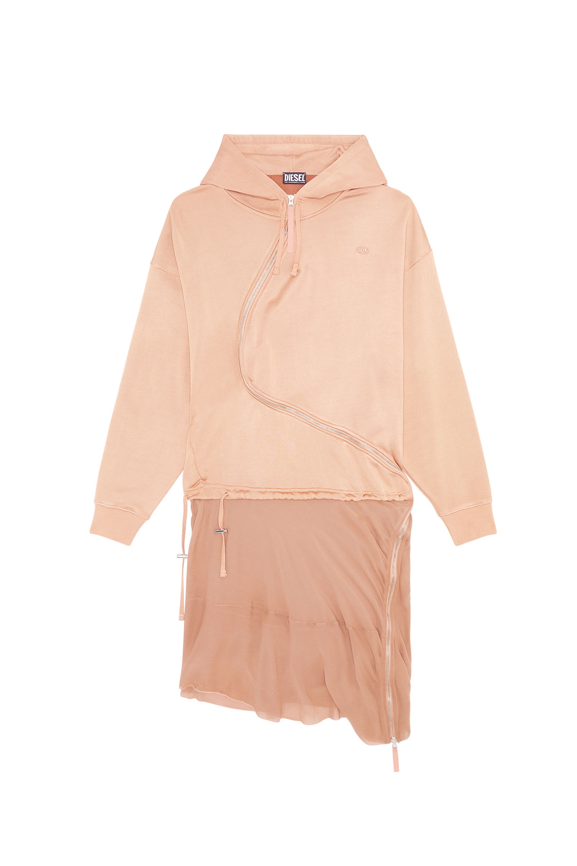 PRODUCT ID: A072740GRAX - Body 51%Cotton 49%Viscose-Rayon - Skirt 100%Viscose-Rayon - Rib 97%Cotton 3%Elastane-Spandex - Fall Winter 2022 Runway Show - Relaxed fit - Hood - Asymmetric zip closure - Stretch ribbed cuffs Model is wearing a size S and is 175 cm / 5'7'' Fits true to size, take your normal size. Hooded sweater dress from the Fall/Winter 2022 Runway Show collection. The relaxed silhouette is crafted from pigment-dyed cotton fleece and tonal fluid viscose chiffon. It's finished with an asymmetrical front zip closure and a flared chiffon skirt, constructed to give the impression of a two-piece set. The dress is finished with an oval D embroidery in the of the chest.