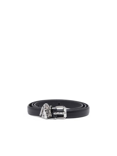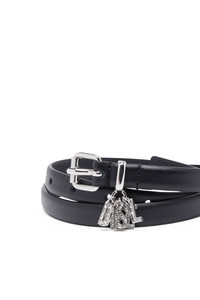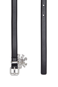Product Description Cut in a slim width, this women’s belt is crafted from shiny Italian leather and fastened with a polished silver roller buckle. The metal logo letter charms dangling from the loop have been bedecked with crystals for a touch of sparkle. ID: X09851PR227 Materials & Details Composition: 100%Cow Leather Buckle closure