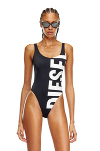 Model is wearing a size S and is 175 cm / 5'7'' Fits true to size, take your normal size. This women's bathing suit is printed with a maxi Diesel logo down the left side, cut off at the edges to form a streamlined high-leg silhouette. It's made from recycled stretch fabric and styled with a classic low-cut back.