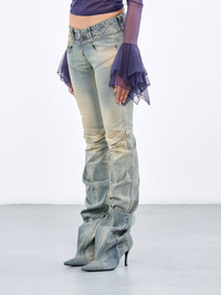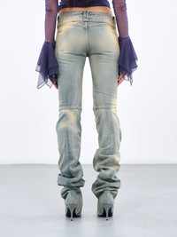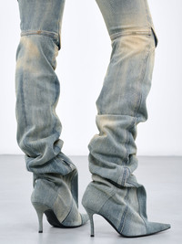 DIESEL pants boots in blue, hydrid design, denim construction, vintage treatment, pants: seam & drape detailing, low-waist, belt loops, exposed zip-fly, three pockets, logo label, skinny fit, boots: inner zip opening, pointed toe, stiletto heel, rubber outsole. US & European Sizing Model is 5'8" wearing size 28/38. Bust: 32" Waist: 26" Hips: 34.5"