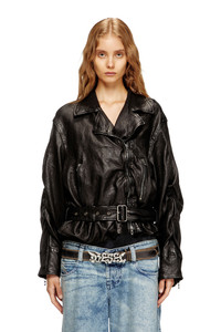 Product Description Fresh from the Fall Winter 2025 Runway Show, this women's biker jacket does what Diesel does best: breaking the rules of conventional style. A boiled treatment gives the jet black leather a three-dimensional texture that drastically distorts and shrinks the shape. A belt cinches in the waist. ID: A207410SLCW Size & Fit Model is wearing an IT size 40 and is 175 cm / 5'7'' Check the size chart to choose the correct size. Materials & Details Composition: 100%Lambskin Leather Fall Winter 2025 Runway Show Off-centre two-way zip closure Zip pockets