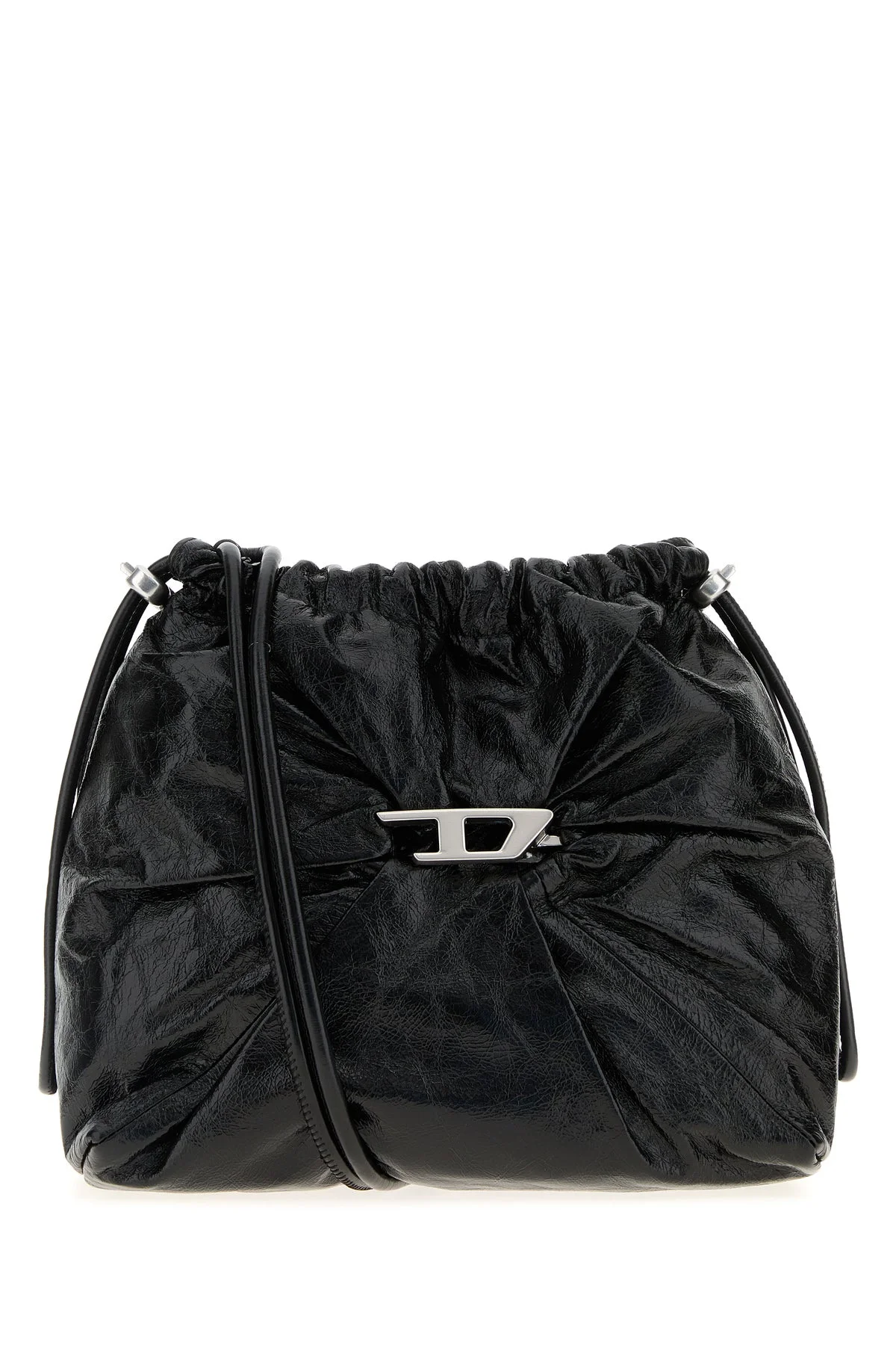 Bucket bag realized in pebble leather enriched by D metal detail at the front. - Drawstring closure - Adjustable tonal leather shoulder strap - Lined interior with a zip pocket and a patch pocket DETAILS Black leather Scrunch-D bucket bag Exterior: 100% Leather Lining: 100% Fabric Finishing: Silver metal Made in Width: 23 cm Height: 21 cm Depth: 9 cm Min shoulder strap length: 10 cm Max shoulder strap length: 55 cm