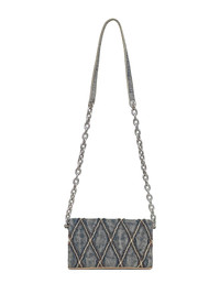 - Foldover-top with snap button fastening - Detachable chunky metal chain handle with crystal logo lettering; detachable chunky metal chain shoulder strap with denim pad - Interior: two main gusseted compartments, flat partition pocket, zipped coin pocket, flat pocket under the flap, eight credit card slots - Diamond-quilted dirty-wash denim design - 20 x 13 x 3 cm; shoulder strap drop: 52 cm - Blue color - 90% cotton, 10% polyurethane - Made in extra eu Natural (Veg): Cotton90 % Synthetic: Polyamide5 % Synthetic: Elastane5 % Made in: Repubblica Popolare Cinese Season: A25 X10281P5570HA001
