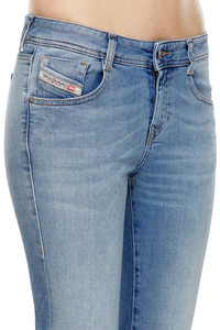 Product Description Bootcut style with a low waist and higher back coverage. This classic slim jean with a bohemien attitude hugs the body from the hips to the knees. Crafted using recycled cotton, this stretch denim features a light blue wash with a clean finish. It's part of Diesel's DNA selection of iconic, essential pieces. ID: A1100309K06 Size & Fit Model is tall 177 cm / 5'10'', the waist measures 60 cm / 23" Check the size chart to choose the correct size. Materials & Details Composition: 98%Cotton 2%Elastane-Spandex Fit: Slim Waist: Low Leg: Bootcut and Flare Closure: Zip fly