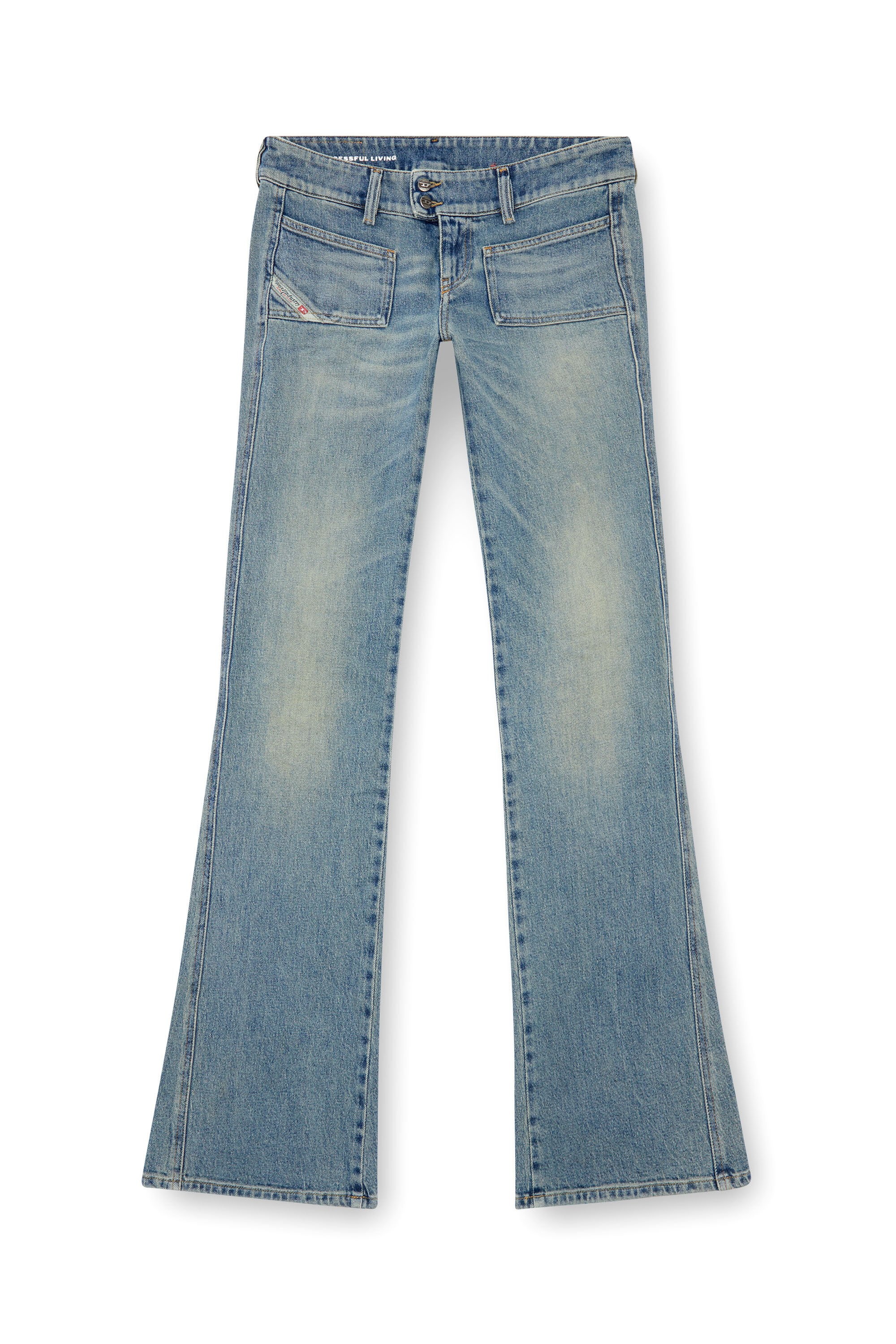 Product Description Slim style with a low waist and bootcut leg. A refreshed take on Diesel's iconic Noughties jean, it features the signature patch pockets and double-button closure of the original design. The iconic eagle motif is layered under the wide back pockets, creating a shaded effect. Crafted from comfort denim in partially recyled cotton, blended with a hint of stretch, this DNA wash channels a vintage Americana aesthetic. The light blue cast has a soft dusty finish that's inspired by classic workwear. ID: A1382009J55 Size & Fit Model is tall 177 cm / 5'10'', the waist measures 60 cm / 23" Check the size chart to choose the correct size. Materials & Details Composition: 99%Cotton 1%Elastane-Spandex Fit: Slim Waist: Low Leg: Bootcut and Flare Closure: Zip fly