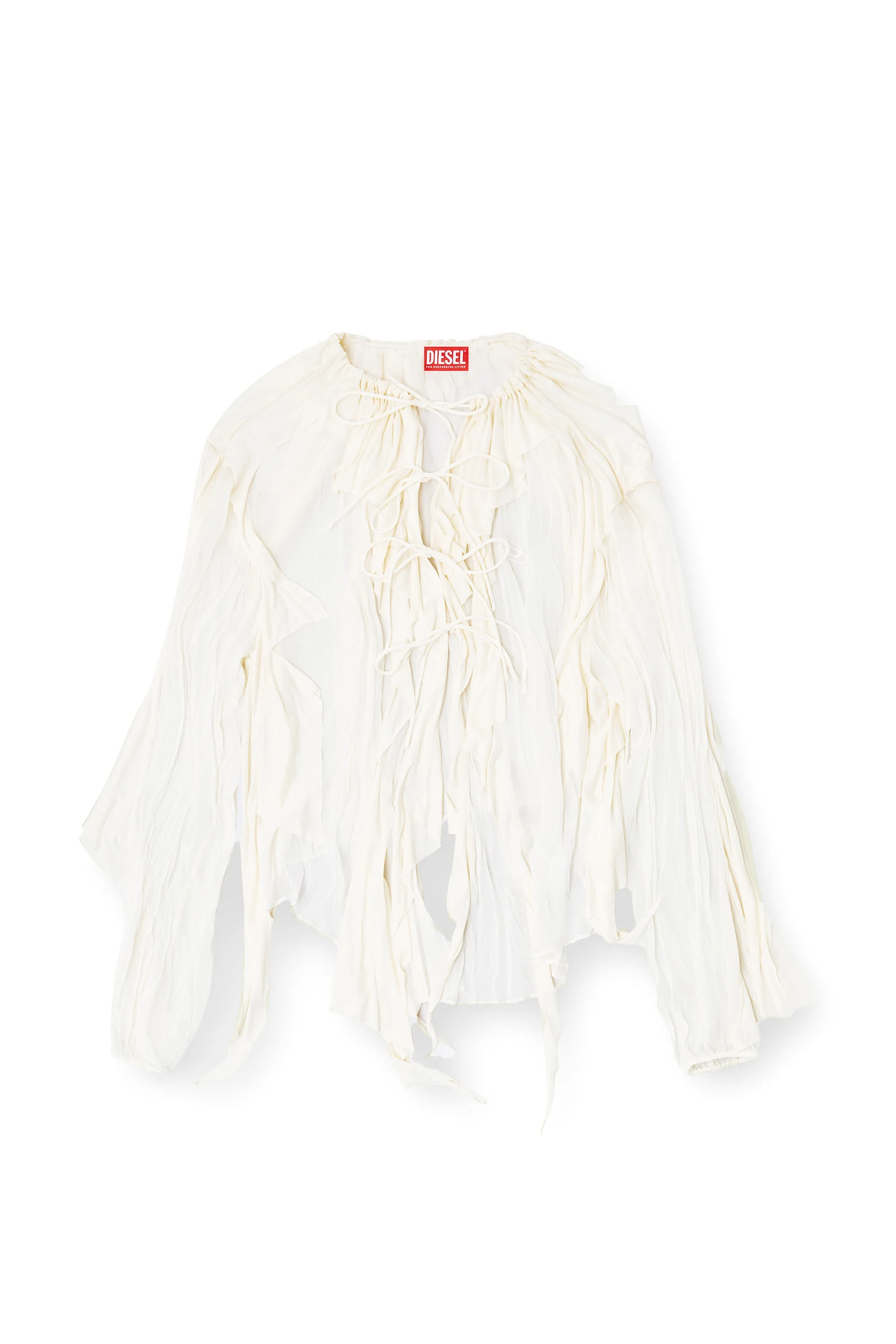 Product Description This women's relaxed blouse is cut from white fluid muslin that's subtly see-through. A steam-crinkled finish creates depth, accentuated with raw-cut asymmetrical jersey flounces and a gathered drawstring collar. It fastens with romantic front ties. ID: A185630KIBL Size & Fit Model is wearing an IT size 40 and is 175 cm / 5'7'' Check the size chart to choose the correct size. Materials & Details Composition: 100%Viscose-Rayon, Application 100%Lyocell Regular fit Front tie closureDrawstring neckElasticated cuffs