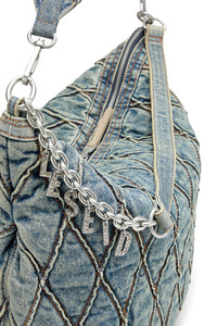 Product Description This women's hobo bag is particularly roomy, and can even fit a laptop. Made from dirty-wash denim quilted in a diamond pattern, one of Diesel's most recognisable and eye-catching textures, it features a matching padded handle to carry the bag under the shoulder. The additional short strap can be used as a double handle or draped across the front of the bag for decoration – the chain is adorned with crystal-studded logo lettering. ID: X10363P5570 Materials & Details Composition: 98%Cotton 2%Polyurethane Detachable padded handle Chain and denim handleZipped topInside: wide zip pocket