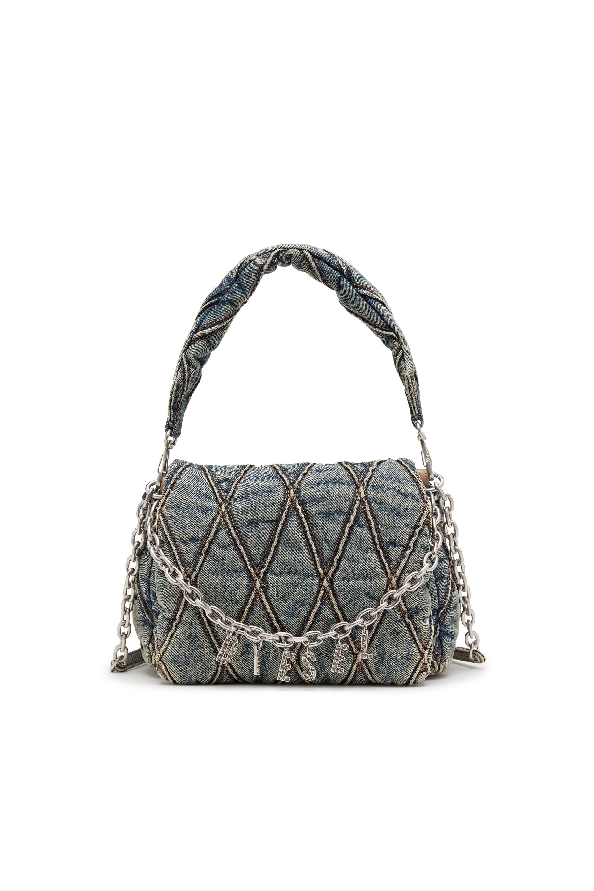 Product Description This women's handbag is crafted from quilted light blue denim, topped with a matching handle. The accessory features a flap closure with a metal Diesel lettering chain, and an internal zipped pocket. ID: X09596P5570 Materials & Details Composition: 100%Cotton Top handle Flap closure Inside: zip pocket Lined in monogram fabric