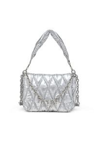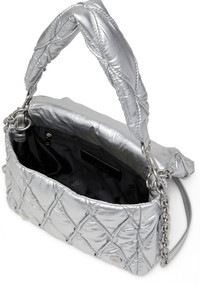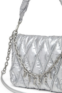 Product Description Women's shoulder bag in shiny metallic nylon. A soft, padded design stitched and quilted in a tactile diamond pattern, this accessory has a soft handle and a longer fabric and chain strap, both of which can be detached. The magnetic flap closure is draped with a chunky removable chain featuring Diesel letter charms and opens to a single compartment with an internal zip pocket. The chain also doubles as a necklace or bracelet. ID: X10265P8240 Materials & Details Composition: 100%Polyamide-Nylon Detachable padded handle Detachable adjustable chain and fabric strapMagnetic flap closureDetachable chain with Diesel charmsInside: zip pocket and logo-jacquard lining