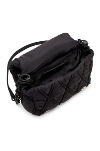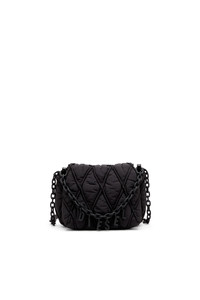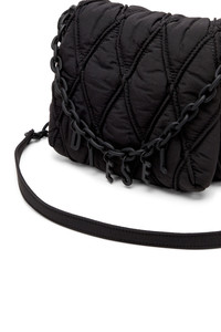 Product Description Women's handbag in wrinkled nylon. Informed by utility and chain play, this compact bag has a soft, padded construction quilted and stitched in argyle diamonds. A matte rubberised chain with dangling logo charms drapes over the flap, adding a playful touch – the accessory also doubles as a necklace or bracelet. Can be carried over the shoulder, crossbody or as a clutch. ID: X10267P8048 Materials & Details Composition: 100%Polyamide-Nylon Detachable quilted-nylon handle Detachable chain-and-fabric strap Magnetic flap closure and internal zip pocket Metal hardware with matte rubberised finish Detachable chain with logo charms, convertible to jewellery