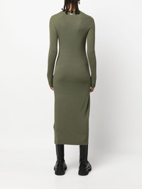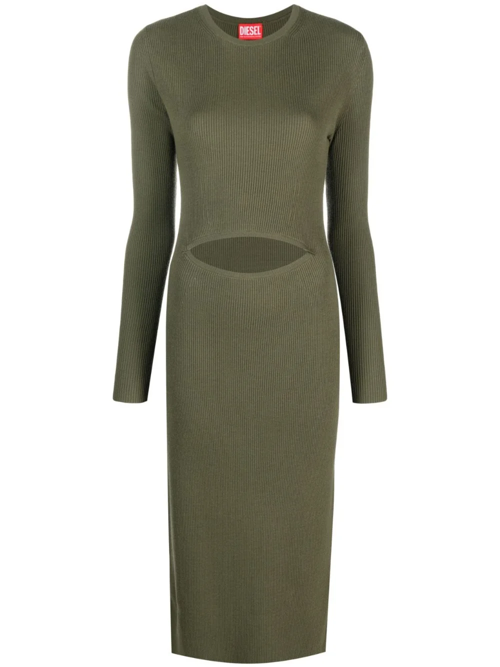 cut-out wool-blend dress The demure long-sleeved midi silhouette of this Diesel dress is offset with a cut-out at the torso to reveal a flash of skin. It’s ribbed-knit with wool threads to a flexible and fitted silhouette and finished with an Oval D applique at the nape for subtle branding. Highlights - Moss green - Wool blend - Ribbed knit - Cut-out detailing - Crew neck - Long sleeves - Applique logo - Straight hem Imported Composition Wool 51%, Viscose 41%, Polyester 8% SIZE & FIT Model measurements Height 5 ft 10 in(1.77 m) Bust/Chest 31.88 in(81 cm) Hips 36.22 in(92 cm) Waist 24.01 in(61 cm) FittingInformation Designed for a close fit throughout Made with a midweight knit, this piece offers some stretch This piece fits true to size – take your usual size Washing instructions Hand Wash