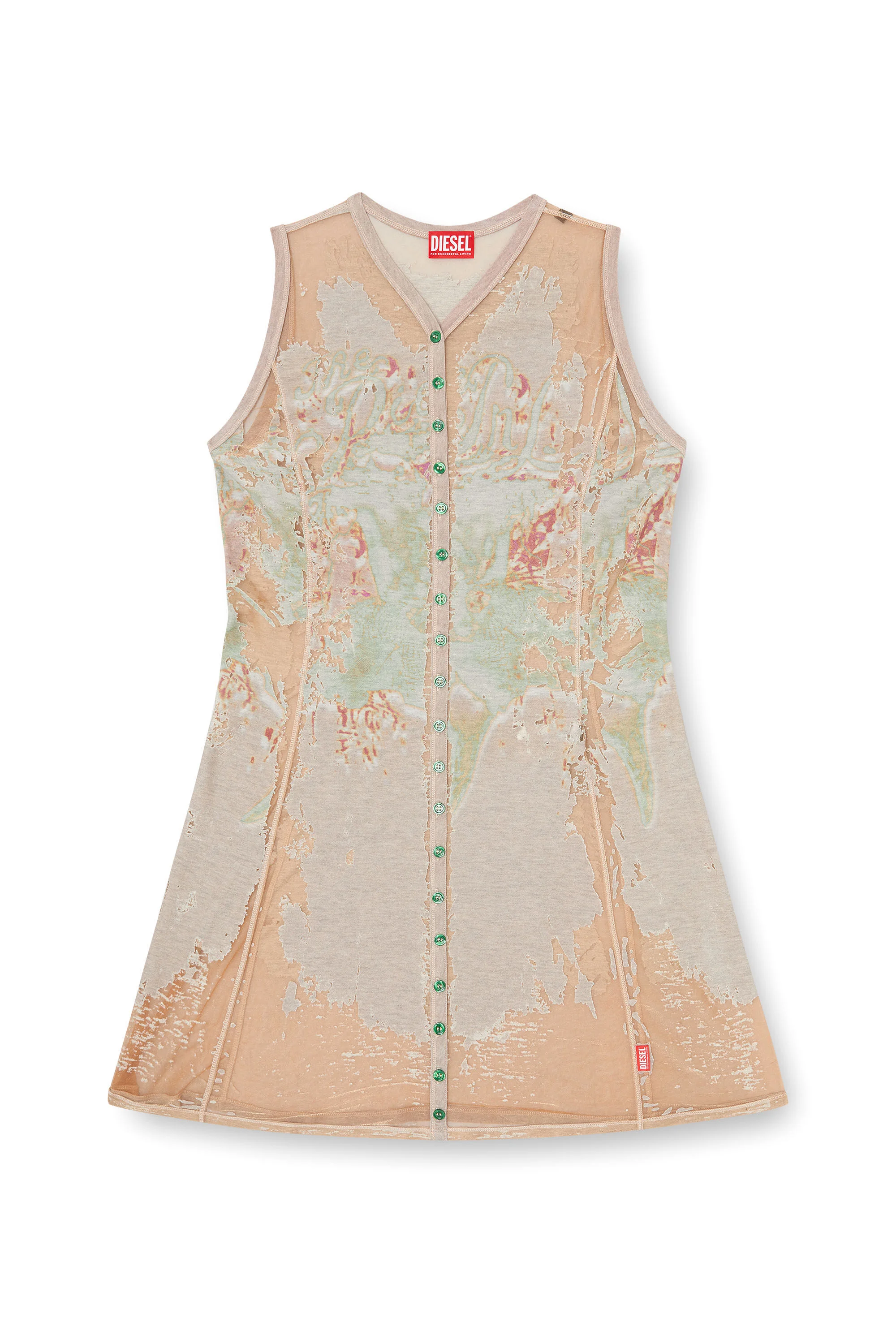 Product Description An exclusive SS26 Runway Show piece, this women's sleeveless mini dress leans into wild experimentation and disruption. Melange stretch jersey in an ECOVERO™ viscose blend becomes the backdrop for a printed take on the hide of an animal that never existed, pushing the look into surreal, feral terrain. A sheerness-injecting devore treatment adds skin-flashing transparency, a fitting full-stop to a look that refuses to play tame. Finished with shiny metallic buttons down the front. ID: A222810SIBV Size & Fit Model is wearing a size S and is 175 cm / 5'7'' Check the size chart to choose the correct size. Materials & Details Composition: 87%Viscose-Rayon 10%Polyester 3%Elastane-Spandex Spring Summer 2026 Runway Show Full-length button closure Unlined