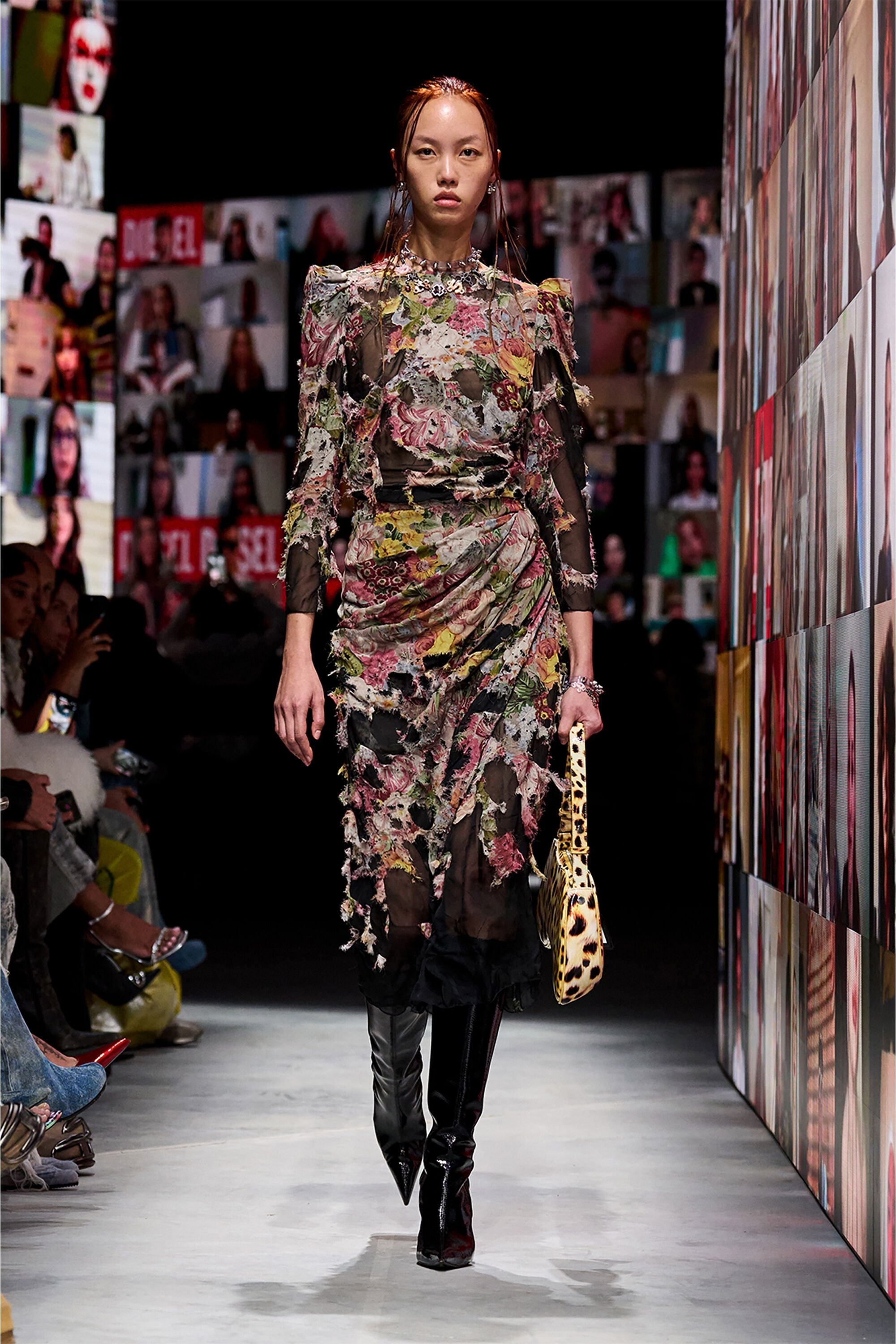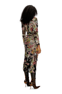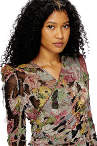 Product Description This puff-sleeve midi dress is part of the FALL WINTER 24 RUNWAY SHOW collection, featuring draping at the waist that falls elegantly into an asymmetrical pencil skirt. A duo of classic-style floral viscose and plain black chiffon is joined together with zig-zag stitching, the top layer burnt away in places using a devore technique to produce Diesel's hallmark distressed look. ID: A167800QMAS Size & Fit Model is wearing an IT size 40 and is 175 cm / 5'7'' Check the size chart to choose the correct size. Materials & Details Composition: Outer 100%Viscose-Rayon, Inner 100%Polyester Fall Winter 2024 Runway Show
