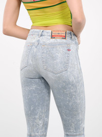 DIESEL leggings in blue, integrated boot & legging design, paneled construction, belt loops, back logo patch, front button & concealed zip fly closure, inset pockets, coin pocket, back patch pockets, logo embroidery, integrated boot & leg, inner side zip closures, modified block heel, rubber tread. European Shoe Sizing Model is 5'8" wearing size 37. Bust: 32" Waist: 26" Hips: 34.5"
