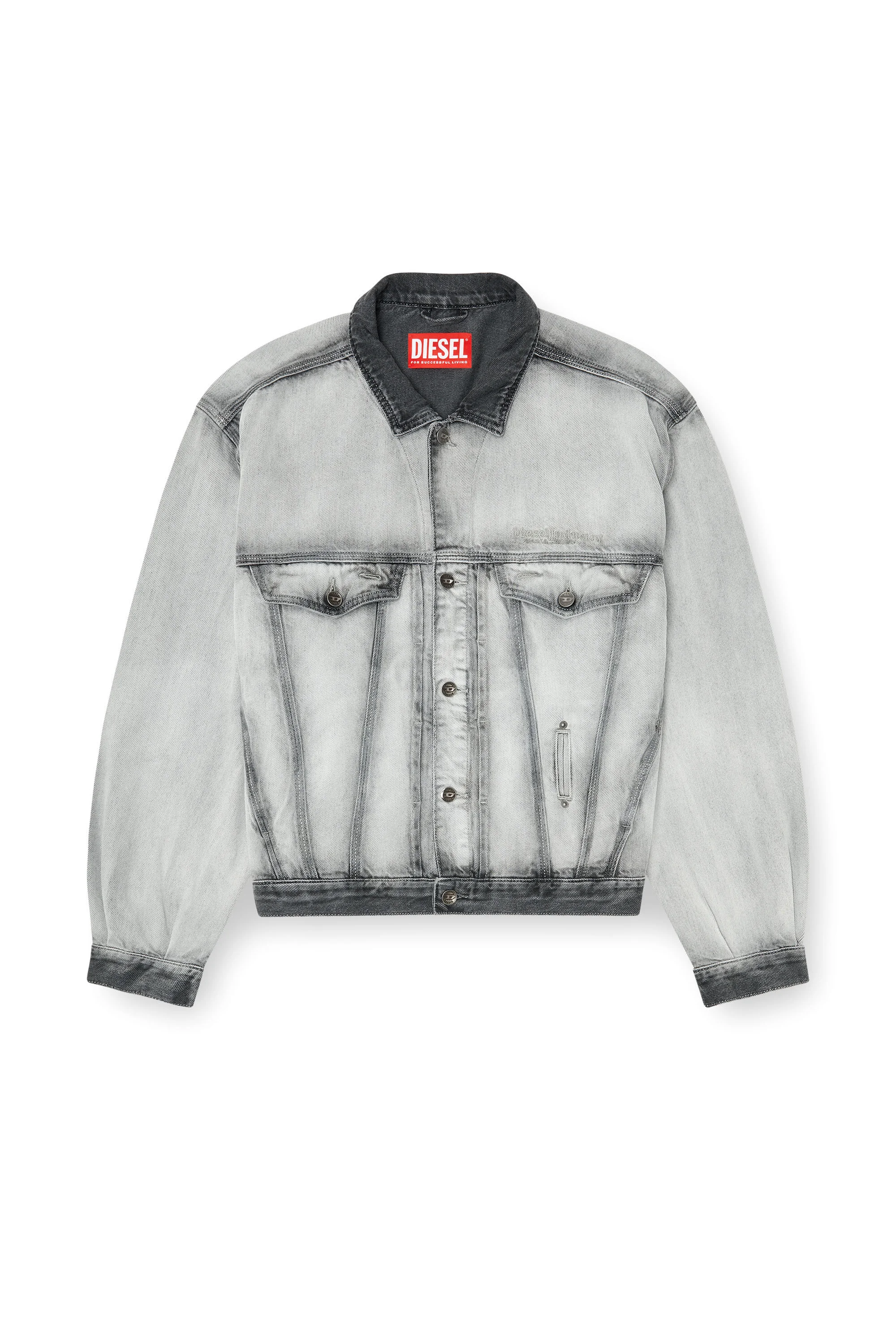 Product Description A contemporary take on an archival design, this trucker jacket nods to '80s aviator silhouettes with its oversized shoulders and slightly cropped, slim-cut hem. Branded metal buttons, eyelet detailing and a tonal embroidered Diesel Industries logo elevate this SS26 Runway collection piece. Made from a soft, medium-lightweight fix denim in cotton and lyocell, this grey wash showcases an eye-catching “skeleton” effect, achieved through manual spray work and precise masking techniques that preserve darker tones along the seams. Sustainable treatments, including synthetic pumice and water-free washing, enhance the worn-in look while reducing environmental impact. A luminous jewel-like button and sulphur-dyed stitching that fades with wear complete this elevated take on a core, everyday piece. ID: A2384209P28 Size & Fit Model is wearing a size L and is 188 cm / 6'2". Model is wearing a size S and is 177 cm / 5'9". Materials & Details Composition: 82%Cotton 18%Lyocell Spring Summer 2026 Runway Show Buttoned chest pockets, side pockets and coin pocket Button cuffs and waist adjusters Metal jeans button closure Unlined