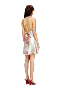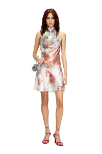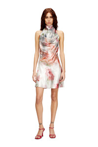 Product Description Party-starting energy, packed into a women’s mini dress. Bias-cut from foiled georgette featuring a blurred rose print, this body-skimming style flows with liquid grace, catching the light in a metallic, wet-look shine. The halter neckline offers an adjustable drape, while barely-there spaghetti straps criss-cross over the open back, complete with a signature Oval D plaque. ID: A203210DMBP Size & Fit Model is wearing an IT size 40 and is 175 cm / 5'7'' Check the size chart to choose the correct size. Materials & Details Composition: 100%Polyester, Coating 100%Aluminum Slim fit Draped neckline with adjustable ties Adjustable spaghetti straps Open back Unlined