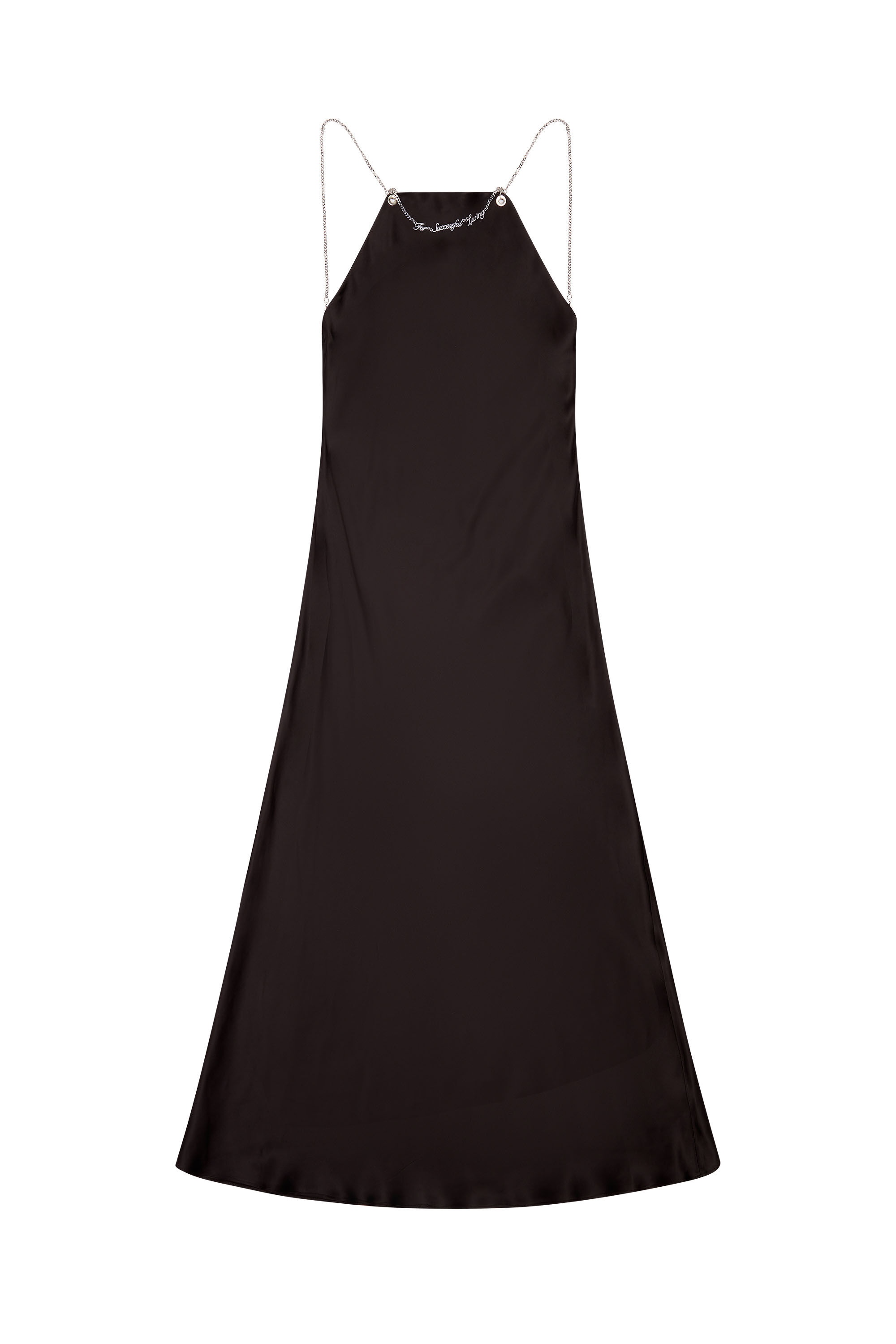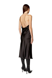 Model is wearing an IT size 40 and is 175 cm / 5'7'' Fits true to size, take your normal size. Women's halterneck dress in black satin. Bias-cut to skim the figure with a fluid feel, this midi style is adorned with fine chains that form the straps and logo necklace, and turns to a softly draped open back.