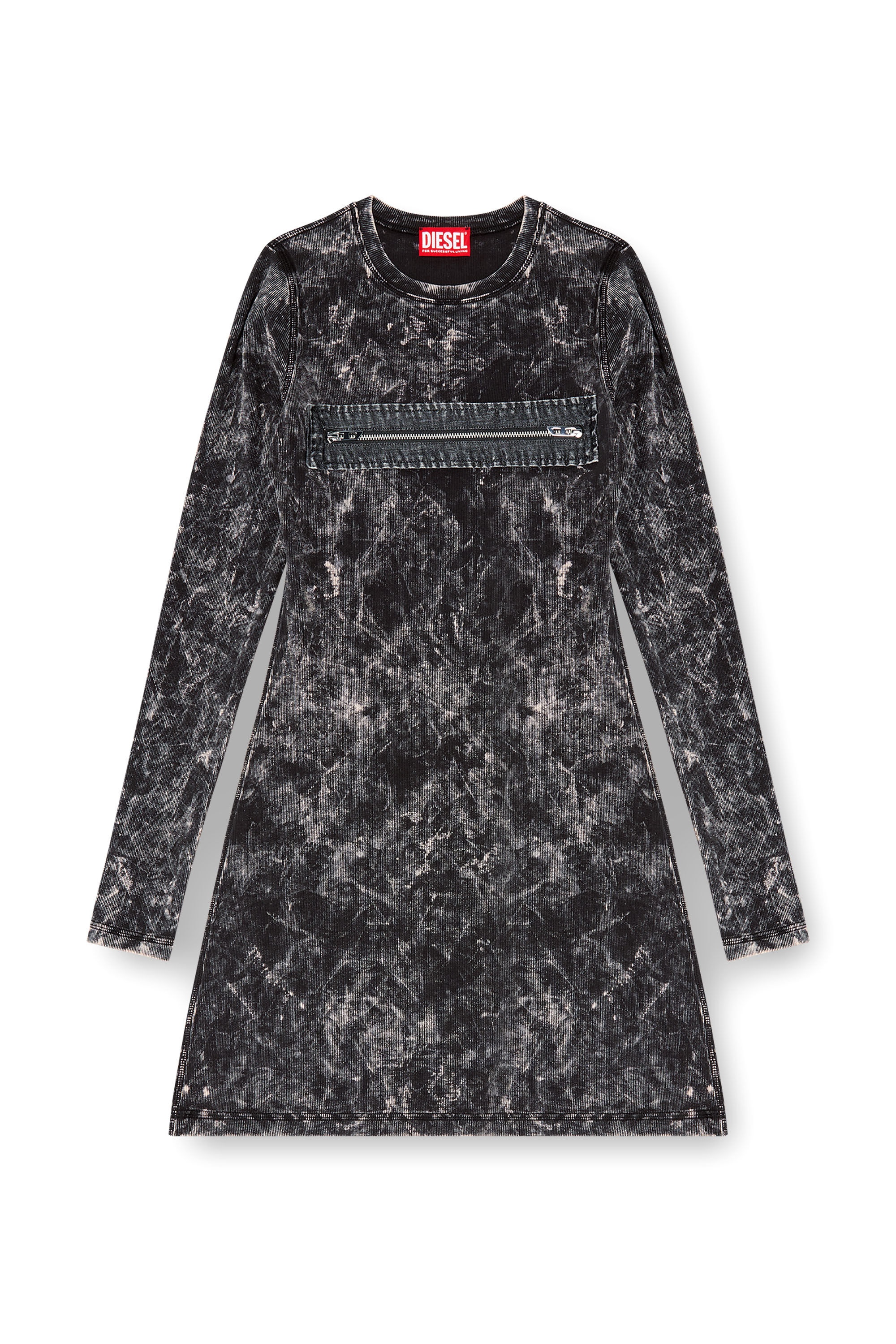 Product Description Women's long-sleeve dress in ribbed stretch jersey, crafted using organic cotton. Treated to recall the crinkled, marbled fade of acid-wash denim, this bodycon mini exposes more than just the legs – the utilitarian, denim-trimmed zip over the decolletage can be adjusted to create skin-flashing cut-outs. External overlock stitching adds an inside-out feel. ID: A173180AKBU Size & Fit Model is wearing a size S and is 175 cm / 5'7'' Check the size chart to choose the correct size. Materials & Details Composition: 94%Cotton 6%Elastane-Spandex, Application 100%Cotton Slim fit Two-way zip fastening chest cut-out Unlined