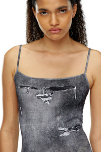 Model is wearing a size S and is 175 cm / 5'7'' Fits true to size, take your normal size. This women's short spaghetti-strap dress is cut from figure-hugging stretch fabric with an abstract pattern featuring a mash-up of metal chain-link fencing, snake scales and tropical flowers. The distressed denim texture is an illusion created with a trompe 'l'oeil print. An embroidered Oval D hallmarks the back.