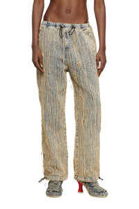 Product Description Relaxed fit with a medium waist, low crotch, and long wide leg. The elasticated waist and cuffs feature adjustable drawstrings. This jacquard-weave fabric is an example of Diesel's denim know-how, offering a sophisticated take on fix denim. Woven with floating threads, it undergoes a stone wash that creates a striking marble effect. A second wash dyes the threads in a beige tone, adding depth and contrast to the design. The result is a refined yet rugged look, where intentional distressing meets artisanal technique. ID: A192770CMBZ Size & Fit Model is wearing a size L and is 188 cm / 6'2". Model is wearing a size S and is 177 cm / 5'9". Materials & Details Composition: 95%COTTON 5%POLYESTER Fit: Relaxed Waist: Mid Wash: Treated Fabric: Non-Stretch Closure: Elastic waistband